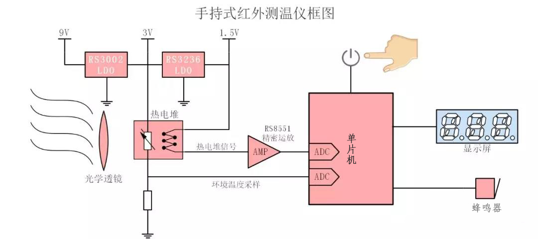 为了扩大温度测量范围,本电路采用9V电池供电,先通过一个高压LDO RS3002把电池电压转为3V,供整个系统使用,包括为单片机,背光灯,运放等器件供电,然后再用一个低功耗LDO RS3236从3V降为1.5V,这样做的目的是给热电堆提供一个参考电压,让整个测量温度范围可以扩大。为了在不同的环境温度下能够计算正确,单片机还必须要读取当前的环境温度,实现方式是通过读取热电堆内部的NTC电阻与固定100kΩ电阻分压的电压点来计算。